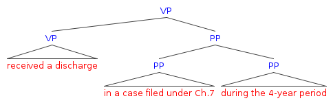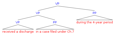 The two interpretations correspond to the following tree diagrams, the second one of which features low attachment of the phrase during the 4-year period…, and is the interpretation favored by the Nearest-Reasonable-Referent canon.
