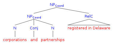 Let’s start with the Nearest-Reasonable-Referent. With respect to postmodification, this canon parallels the tendency toward low attachment that I talked about in connection with the rule of the last antecedent. This is hardly surprising. The Nearest-Reasonable-Referent Canon as formulated by Scalia and Garner was carved out from the rule of the last antecedent. And in a tree diagram, the way to show that a word or phrase modifies only “the nearest reasonable [preceding] referent” is to show it as attaching lower in the tree than if it modified all the reasonable preceding referents.