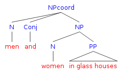 Before I explain that answer, a note is in order about the terminology I’ll be using. When linguists use tree diagrams like the ones above, they typically describe the relationship of the various parts of a phrase in terms of how the part of the diagram representing the phrase is “attached” to the portion of the tree that precedes it. When there are multiple potential attachment sites, the expression is syntactically ambiguous, with each possible structure typically corresponding to a different interpretation. It is common to distinguish between the potential attachment sites in terms of whether they are high or low on the tree diagram Thus, in diagram (a), the phrase in glass houses attaches low in the diagram to the noun women, while in (b) it attaches higher in the diagram to the larger phrase men and women. Low attachment corresponds to the interpretation called for by the rule of the last antecedent. This can be seen by the fact that the modifier in glass houses combines with women to form the noun phrase women in glass houses, which then combines with men to form the larger noun phrase [[men] and [women in glass houses].